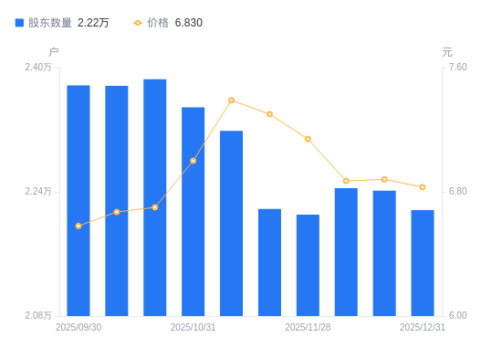 1月6日消息,数据显示,截至2025年12月31日,天禾股份A股股东总户数为2.22万户,较上期(2025年12月19日)减少249户,降幅1.11%。公司最新A股总股本为3.48亿股,其中流通A股3.44亿股,户均持有流通A股数量为1.55万股,较上期增加172.25股,增幅1.12%;户均持流通A股市值10.59万元,较上期增加409.79元,增幅0.39%。