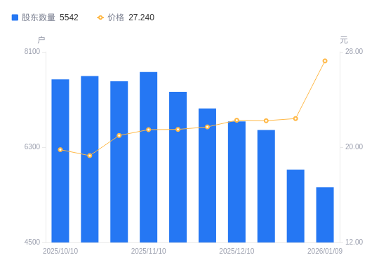 1月13日消息,数据显示,截至2026年1月9日,*ST声迅A股股东总户数为5542户,较上期(2025年12月31日)减少336户,降幅5.72%。公司最新A股总股本为8186.23万股,其中流通A股6874.12万股,户均持有流通A股数量为1.24万股,较上期增加709.04股,增幅6.06%;户均持流通A股市值33.79万元,较上期增加7.59万元,增幅28.98%。