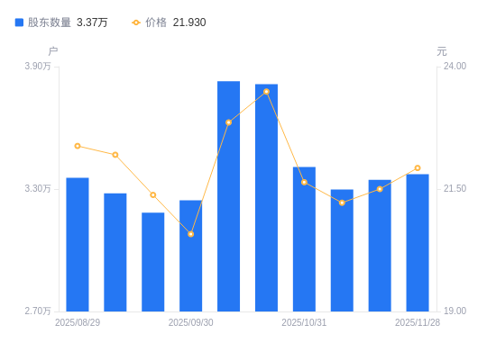 近一年(2024年12月31日至2025年11月28日),竞业达A股股东户数从2.4万户,增加至3.37万户,增幅40.53%,区间股价上涨9.10%。