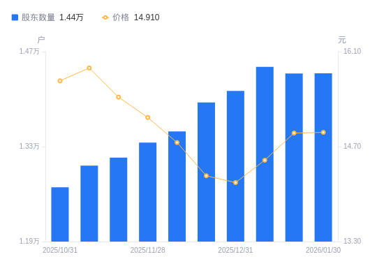 近一年(2025年2月20日至2026年1月30日),地铁设计A股股东户数从1.94万户,减低至1.44万户,降幅25.93%,区间股价下跌9.53%。