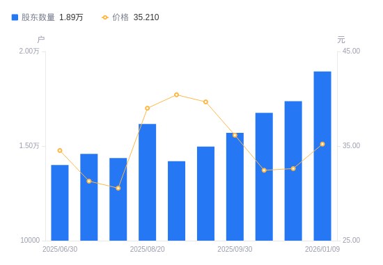 近一年(2025年1月20日至2026年1月9日),宸展光电A股股东户数从1.67万户,增加至1.89万户,增幅13.15%,区间股价上涨46.34%。