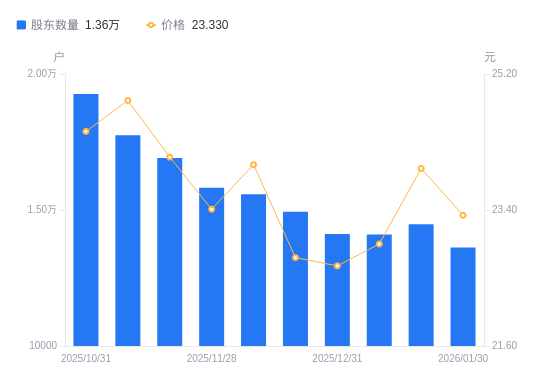 2月4日消息,数据显示,截至2026年1月30日,彩虹集团A股股东总户数为1.36万户,较上期(2026年1月20日)减少851户,降幅5.88%。公司最新A股总股本为1.05亿股,其中流通A股1.05亿股,户均持有流通A股数量为7713.92股,较上期增加453.48股,增幅6.25%;户均持流通A股市值18万元,较上期增加6078.16元,增幅3.50%。