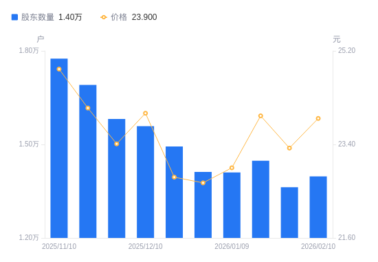 2月12日消息,数据显示,截至2026年2月10日,彩虹集团A股股东总户数为1.4万户,较上期(2026年1月30日)增加349户,增幅2.56%。公司最新A股总股本为1.05亿股,其中流通A股1.05亿股,户均持有流通A股数量为7521.26股,较上期减少192.65股,降幅2.50%;户均持流通A股市值17.98万元,较上期减少207.51元,降幅0.12%。