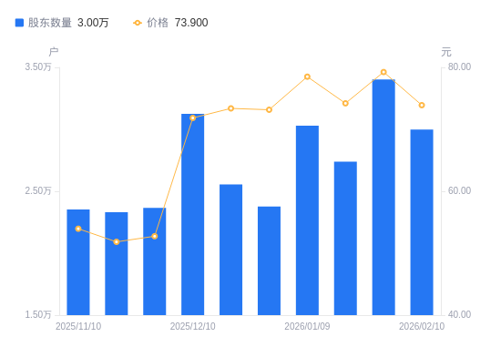 2月11日消息,数据显示,截至2026年2月10日,中瓷电子A股股东总户数为3万户,较上期(2026年1月30日)减少4047户,降幅11.90%。公司最新A股总股本为4.51亿股,其中流通A股3.4亿股,户均持有流通A股数量为1.13万股,较上期增加1350.04股,增幅13.50%;户均持流通A股市值83.87万元,较上期增加4.63万元,增幅5.84%。