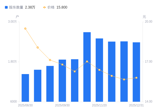 近一年(2024年12月31日至2025年12月31日),鑫铂股份A股股东户数从1.5万户,增加至2.38万户,增幅58.97%,区间股价下跌7.41%。
