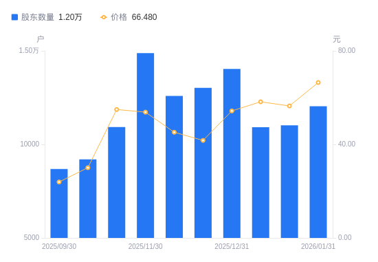 2月2日消息,数据显示,截至2026年1月31日,真爱美家A股股东总户数为1.2万户,较上期(2026年1月20日)增加1024户,增幅9.29%。公司最新A股总股本为1.44亿股,其中流通A股1.37亿股,户均持有流通A股数量为1.14万股,较上期减少1055.62股,降幅8.50%;户均持流通A股市值75.52万元,较上期增加5.44万元,增幅7.76%。