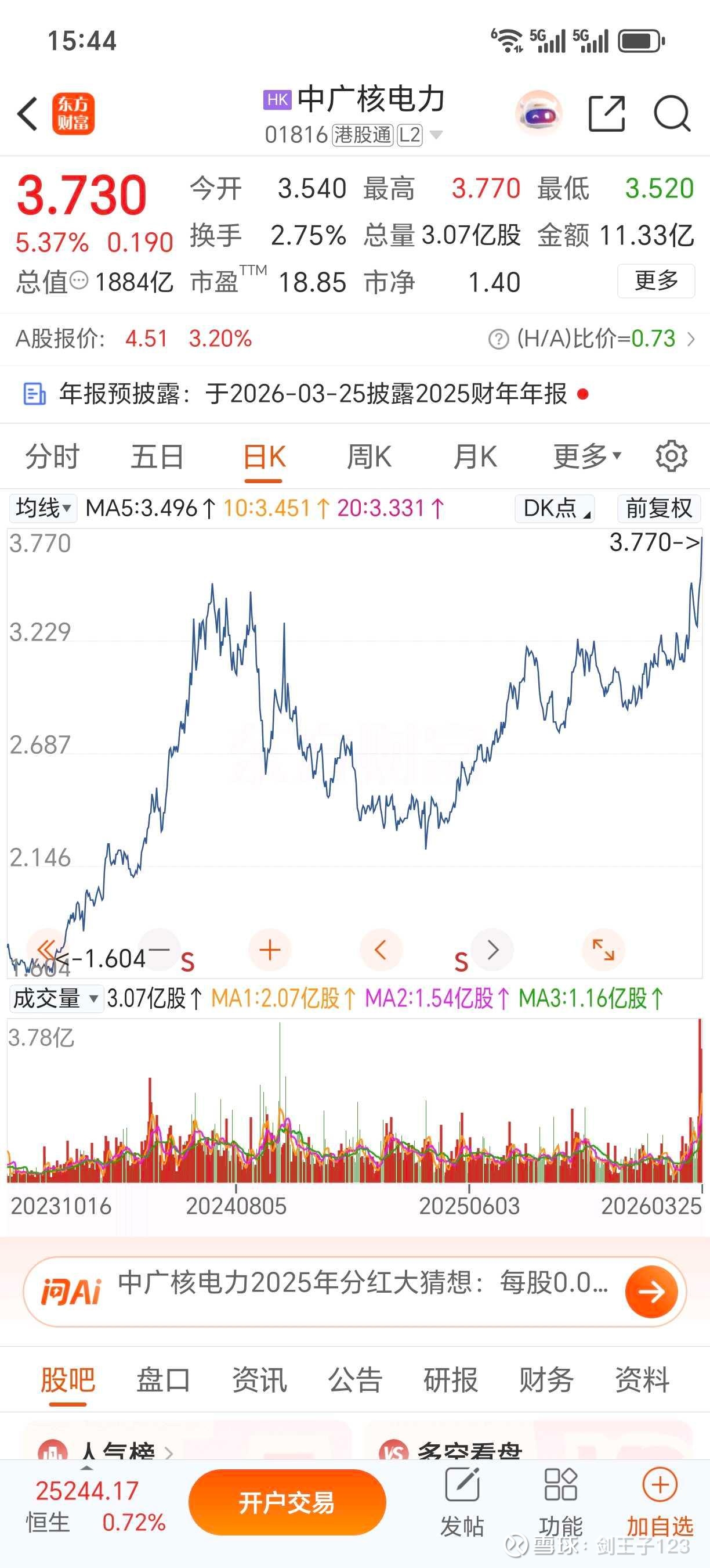 :中广核电力年报公布,业绩还好。每股收益0.193,派息0.086,,派息率约46%。虽派息率远低于行业大部分央国企的60-70%,但也算有进步。。