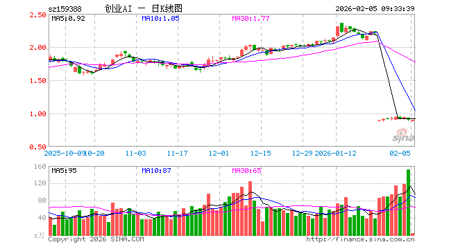 2月5日,创业板人工智能ETF国泰(159388)开盘跌2.76%,报0.880元。创业板人工智能ETF国泰(159388)重仓股方面,中际旭创开盘涨0.18%,新易盛跌2.05%,天孚通信跌5.00%,蓝色光标跌3.05%,协创数据跌2.85%,同花顺跌1.13%,润和软件跌1.25%,北京君正跌3.56%,润泽科技跌4.73%,昆仑万维跌3.92%。