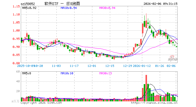 2月6日,软件ETF(159852)开盘跌0.77%,报0.902元。软件ETF(159852)重仓股方面,科大讯飞开盘跌0.90%,金山办公跌0.82%,同花顺跌0.28%,指南针跌1.00%,恒生电子跌0.93%,拓维信息跌0.61%,润和软件跌0.70%,三六零跌1.18%,软通动力跌0.56%。