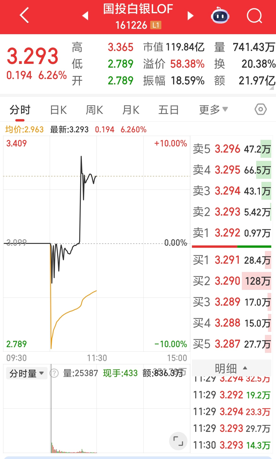 2月9日,国投白银LOF复牌触及跌停后震荡拉升,涨幅一度扩大至超8%,截至上午收盘涨6.26%。截至今日10点30分复牌开盘,国投白银LOF曾连续六次复牌跌停。国投瑞银基金2月6日发布公告称,已成立工作组,积极解决白银LOF基金投资者诉求。