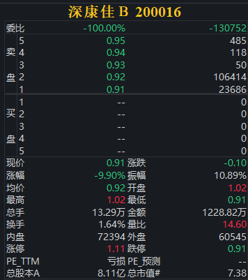 11月30日,深康佳B(200016.SZ)股价跌停,股价跌破一元,报0.91元/股;收盘封单2.37万手,且在0.92元处有卖单超过10.64万手,折合约979万元。沪深交易所公布的交易公开信息显示,深康佳B因当天跌幅偏离值达7%而上榜。