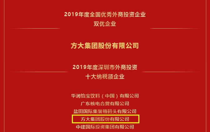 1月8日,全国优秀外商投资企业年度评选深圳榜单揭晓,方大集团(000055)荣获2019年度全国优秀外商投资企业――双优企业和2019年度全国优秀外商投资企业深圳市十大纳税额企业。