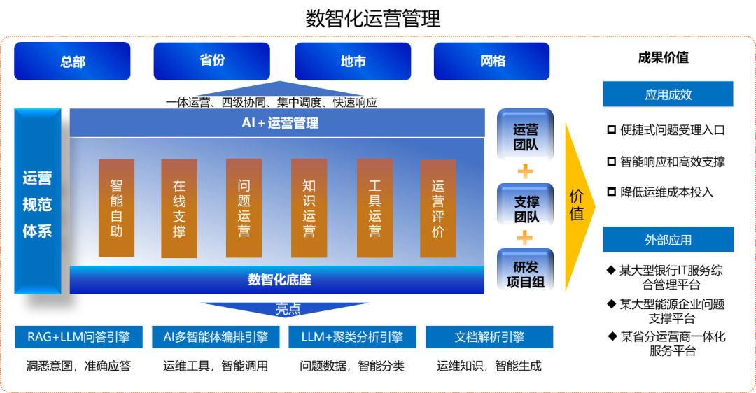 技术融合创新:集成大模型、RAG、AI Agent,实现智能应答、多轮对话与自动化处理能力。全场景覆盖:面向一线、支撑、运营、管理等角色,覆盖问题提出、处理、分析到决策的全流程。数据驱动决策:构建IT运维问题数仓,通过聚类分析和知识生成支撑实时运营视图。