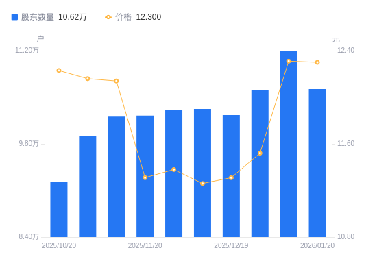 1月21日消息,数据显示,截至2026年1月20日,神州泰岳A股股东总户数为10.62万户,较上期(2026年1月9日)减少5683户,降幅5.08%。公司最新A股总股本为19.67亿股,其中流通A股18.44亿股,户均持有流通A股数量为1.74万股,较上期增加881.47股,增幅5.35%;户均持流通A股市值21.35万元,较上期增加1.07万元,增幅5.26%。