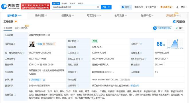 华谊兄弟电影有限公司成立于2015年12月,注册资本1亿人民币,经营范围包括图文设计、电商技术开发、影视后期制作等。股东信息显示,该公司由华谊兄弟全资持股。