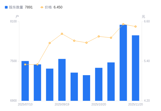 11月20日消息,数据显示,截至2025年11月10日,*ST天龙A股股东总户数为8052户,较上期(2025年10月31日)增加571户,增幅7.63%。公司最新A股总股本为2.01亿股,其中流通A股2亿股,户均持有流通A股数量为2.49万股,较上期减少1899.26股,降幅7.09%;户均持流通A股市值16.22万元,较上期减少1402.32元,降幅0.86%。
