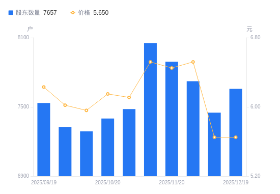 12月24日消息,数据显示,截至2025年12月19日,*ST天龙A股股东总户数为7657户,较上期(2025年12月10日)增加207户,增幅2.78%。公司最新A股总股本为2.01亿股,其中流通A股2亿股,户均持有流通A股数量为2.62万股,较上期减少727.05股,降幅2.70%;户均持流通A股市值14.78万元,较上期减少4107.86元,降幅2.70%。