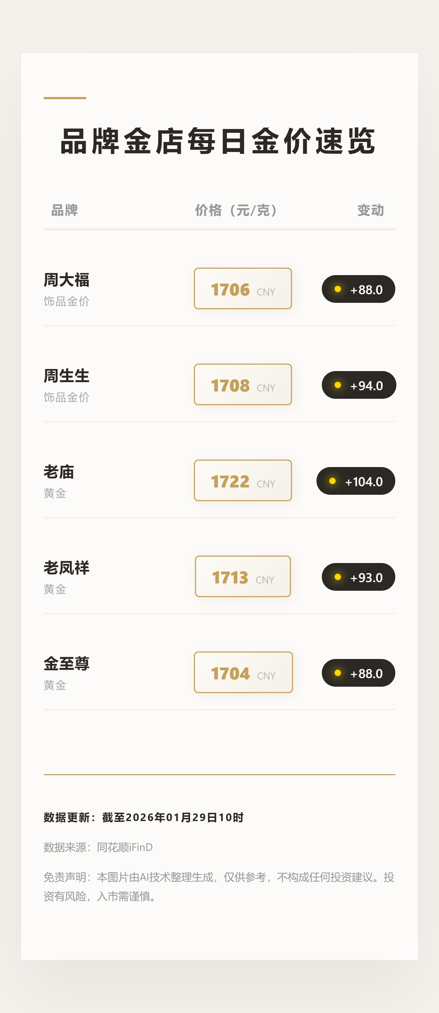 据同花顺(300033)iFinD数据,今日国内黄金珠宝品牌公布的境内足金首饰价格较昨日集体上涨,最高报1722元/克。