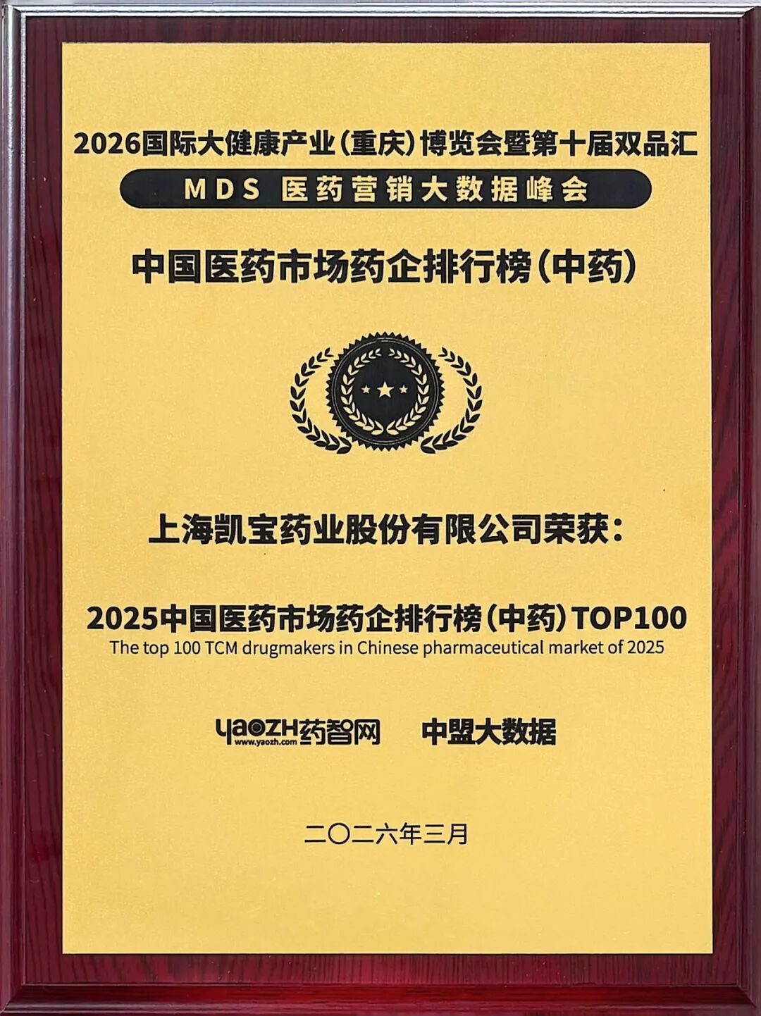 近日,2026国际大健康产业(重庆)博览会暨第十届双品汇在重庆隆重举行。会上,MDS医药营销大数据峰会发布了“中国医药市场药企排行榜(中药)”,上海凯宝药业股份有限公司凭借卓越的市场表现与品牌影响力,荣登2025中国医药市场药企排行榜(中药)TOP100。