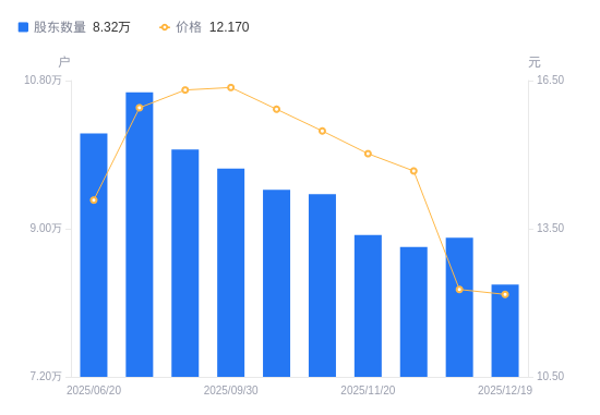12月25日消息,数据显示,截至2025年12月10日,天源迪科A股股东总户数为8.89万户,较上期(2025年11月28日)增加1117户,增幅1.27%。公司最新A股总股本为6.38亿股,其中流通A股5.46亿股,户均持有流通A股数量为6142.13股,较上期减少78.16股,降幅1.26%;户均持流通A股市值7.54万元,较上期减少1.59万元,降幅17.41%。