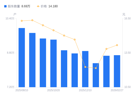 近一年(2025年2月28日至2026年2月27日),天源迪科A股股东户数从8.93万户,减低至8.69万户,降幅2.65%,区间股价下跌12.01%。