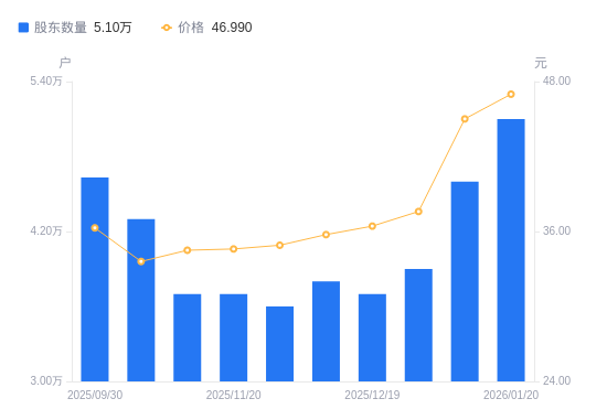 近一年(2024年12月31日至2025年12月31日),鼎龙股份A股股东户数从3.52万户,增加至3.9万户,增幅10.80%,区间股价上涨39.00%。