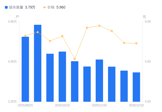 12月12日消息,数据显示,截至2025年12月10日,万顺新材A股股东总户数为3.79万户,较上期(2025年11月28日)减少363户,降幅0.95%。公司最新A股总股本为8.98亿股,其中流通A股7.25亿股,户均持有流通A股数量为1.92万股,较上期增加181.86股,增幅0.96%;户均持流通A股市值11.41万元,较上期增加894.19元,增幅0.79%。