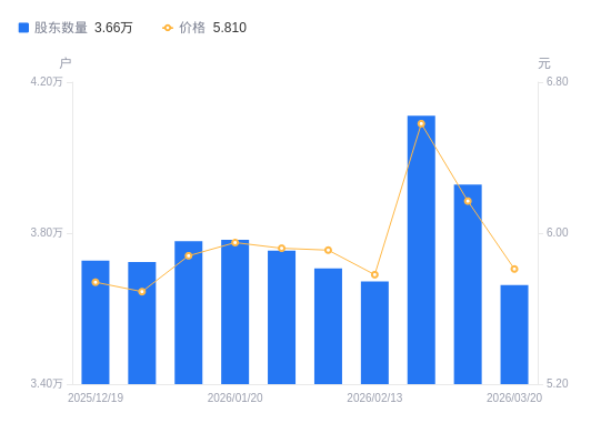 3月23日消息,数据显示,截至2026年3月20日,万顺新材A股股东总户数为3.66万户,较上期(2026年3月10日)减少2662户,降幅6.78%。公司最新A股总股本为8.98亿股,其中流通A股7.25亿股,户均持有流通A股数量为1.98万股,较上期增加1341.34股,增幅7.27%;户均持流通A股市值11.5万元,较上期增加1148.93元,增幅1.01%。