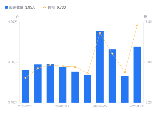 近一年(2025年3月31日至2026年3月31日),万顺新材A股股东户数从4.34万户,减低至3.95万户,降幅8.92%,区间股价上涨33.80%。