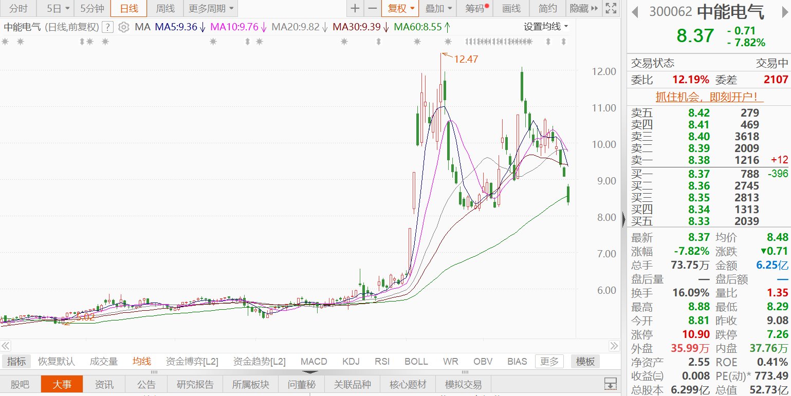 中能电气(300062.SZ)今日跳空低开,现跌7.82%报8.37元,总市值52.73亿元;近3个交易日,该股累计跌幅超15%。中能电气公告称,公司决定终止筹划收购山东达驰电气有限公司等65%股权及转让方对标的企业享有的债权的重大资产重组事项。公司未参与标的公司本轮股权及债权竞拍,也未缴纳保证金。标的公司已由其他合格竞买方摘牌受让。公司未与交易对方签署相关协议,不涉及违约责任。终止重组不会对公司正常业务产生重大不利影响。公司承诺一个月内不再筹划重大资产重组事项。(格隆汇)