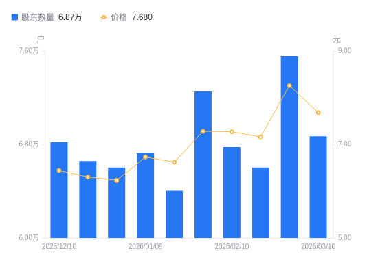 3月16日消息,数据显示,截至2026年3月10日,三川智慧A股股东总户数为6.87万户,较上期(2026年2月27日)减少6835户,降幅9.05%。公司最新A股总股本为10.4亿股,其中流通A股10.06亿股,户均持有流通A股数量为1.46万股,较上期增加1325.08股,增幅9.95%;户均持流通A股市值11.25万元,较上期增加2452.24元,增幅2.23%。