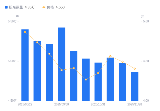 12月1日消息,数据显示,截至2025年11月28日,安诺其A股股东总户数为4.86万户,较上期(2025年11月20日)减少1146户,降幅2.30%。公司最新A股总股本为11.54亿股,其中流通A股9.37亿股,户均持有流通A股数量为1.93万股,较上期增加444.02股,增幅2.36%;户均持流通A股市值8.97万元,较上期减少572.61元,降幅0.63%。