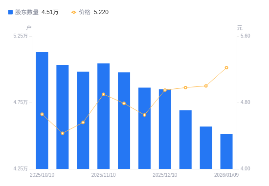 1月21日消息,数据显示,截至2026年1月20日,安诺其A股股东总户数为4.4万户,较上期(2026年1月9日)减少1112户,降幅2.47%。公司最新A股总股本为11.54亿股,其中流通A股9.37亿股,户均持有流通A股数量为2.13万股,较上期增加525.32股,增幅2.53%;户均持流通A股市值10.87万元,较上期增加185.09元,增幅0.17%。