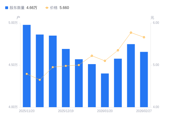 3月3日消息,数据显示,截至2026年2月27日,安诺其A股股东总户数为4.66万户,较上期(2026年2月10日)减少920户,降幅1.94%。公司最新A股总股本为11.54亿股,其中流通A股9.37亿股,户均持有流通A股数量为2.01万股,较上期增加390.08股,增幅1.98%;户均持流通A股市值11.4万元,较上期增加36.11元,增幅0.03%。