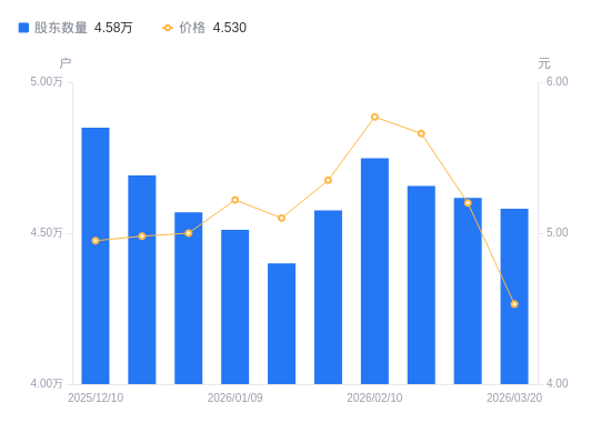 3月23日消息,数据显示,截至2026年3月20日,安诺其A股股东总户数为4.58万户,较上期(2026年3月10日)减少358户,降幅0.78%。公司最新A股总股本为11.54亿股,其中流通A股9.37亿股,户均持有流通A股数量为2.05万股,较上期增加158.67股,增幅0.78%;户均持流通A股市值9.27万元,较上期减少1.29万元,降幅12.20%。