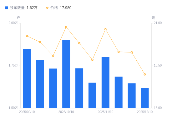 12月12日消息,数据显示,截至2025年12月10日,金利华电A股股东总户数为1.62万户,较上期(2025年11月28日)减少272户,降幅1.65%。公司最新A股总股本为1.17亿股,其中流通A股1.17亿股,户均持有流通A股数量为7230.7股,较上期增加119.54股,增幅1.68%;户均持流通A股市值13万元,较上期减少7095.23元,降幅5.18%。