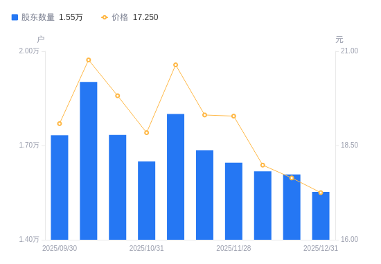 1月5日消息,数据显示,截至2025年12月31日,金利华电A股股东总户数为1.55万户,较上期(2025年12月19日)减少558户,降幅3.47%。公司最新A股总股本为1.17亿股,其中流通A股1.17亿股,户均持有流通A股数量为7537.2股,较上期增加261.54股,增幅3.59%;户均持流通A股市值13万元,较上期增加1673.99元,增幅1.30%。