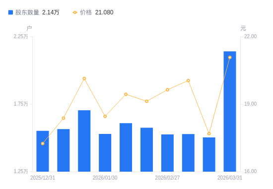 4月2日消息,数据显示,截至2026年3月31日,金利华电A股股东总户数为2.14万户,较上期(2026年3月20日)增加6380户,增幅42.43%。公司最新A股总股本为1.17亿股,其中流通A股1.17亿股,户均持有流通A股数量为5463.21股,较上期减少2318.12股,降幅29.79%;户均持流通A股市值11.52万元,较上期减少2.25万元,降幅16.34%。