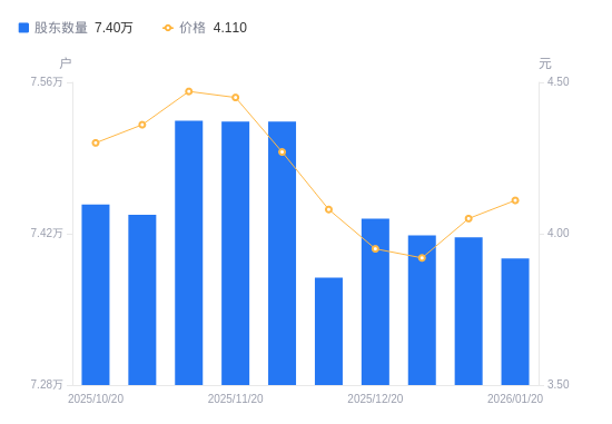 近一年(2025年1月20日至2026年1月20日),碧水源A股股东户数从7.83万户,减低至7.4万户,降幅5.49%,区间股价下跌13.58%。