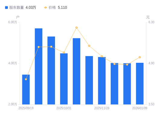 近一年(2025年1月20日至2026年1月20日),易成新能A股股东户数从3.92万户,增加至4.03万户,增幅2.91%,区间股价上涨18.14%。