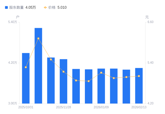 近一年(2025年2月28日至2026年2月13日),易成新能A股股东户数从3.83万户,增加至4.05万户,增幅5.81%,区间股价上涨18.72%。