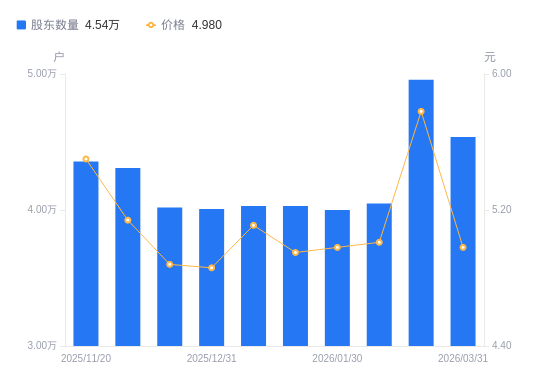近一年(2025年3月31日至2026年3月31日),易成新能A股股东户数从3.9万户,增加至4.54万户,增幅16.41%,区间股价上涨28.68%。
