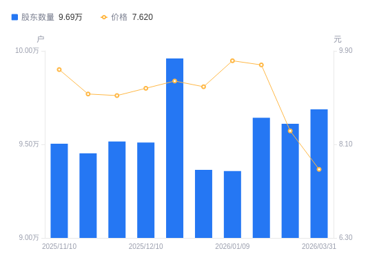 3月31日消息,数据显示,截至2026年3月31日,创世纪A股股东总户数为9.69万户,较上期(2026年3月10日)增加770户,增幅0.80%。公司最新A股总股本为16.65亿股,其中流通A股14.93亿股,户均持有流通A股数量为1.54万股,较上期减少123.49股,降幅0.79%;户均持流通A股市值11.74万元,较上期减少1.24万元,降幅9.58%。