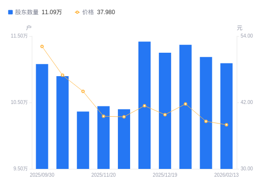 近一年(2025年3月20日至2026年2月13日),银之杰A股股东户数从13.56万户,减低至11.09万户,降幅18.21%,区间股价下跌5.00%。