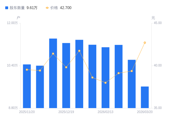 3月24日消息,数据显示,截至2026年3月20日,银之杰A股股东总户数为9.61万户,较上期(2026年3月10日)减少1.01万户,降幅9.47%。公司最新A股总股本为7.07亿股,其中流通A股6.52亿股,户均持有流通A股数量为6783.25股,较上期增加642.56股,增幅10.46%;户均持流通A股市值28.96万元,较上期增加4.79万元,增幅19.84%。