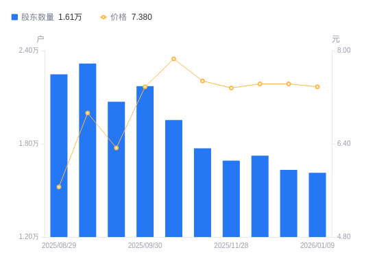 1月15日消息,数据显示,截至2026年1月9日,ST易联众A股股东总户数为1.61万户,较上期(2025年12月31日)减少192户,降幅1.18%。公司最新A股总股本为4.3亿股,其中流通A股4.3亿股,户均持有流通A股数量为2.67万股,较上期增加313.55股,增幅1.19%;户均持流通A股市值19.67万元,较上期增加996.85元,增幅0.51%。