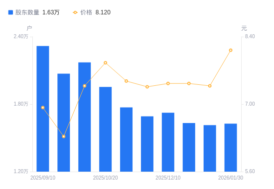 近一年(2025年2月10日至2026年1月30日),ST易联众A股股东户数从2.11万户,减低至1.63万户,降幅22.96%,区间股价上涨142.39%。