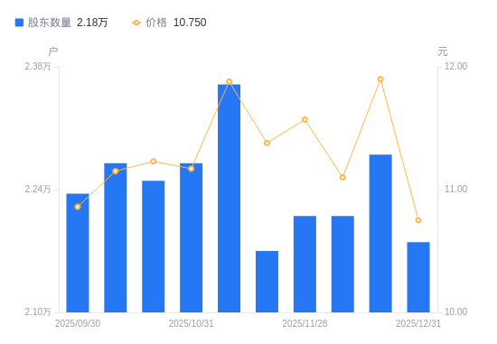 近一年(2024年12月31日至2025年12月31日),西部牧业A股股东户数从2.46万户,减低至2.18万户,降幅11.55%,区间股价上涨18.13%。