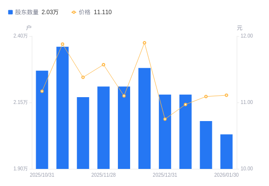 2月1日消息,数据显示,截至2026年1月30日,西部牧业A股股东总户数为2.03万户,较上期(2026年1月20日)减少500户,降幅2.40%。公司最新A股总股本为2.11亿股,其中流通A股2.11亿股,户均持有流通A股数量为1.04万股,较上期增加250.25股,增幅2.46%;户均持流通A股市值11.57万元,较上期增加2983.5元,增幅2.65%。