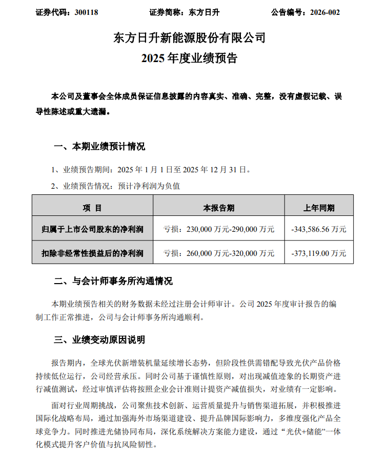 东方日升的业绩预告揭开了一个残酷的现实:即便全球光伏新增装机量仍在增长,但企业未必能分到羹。公司预计2025年归属于上市公司股东的净利润亏损230,000万元至290,000万元,扣非后净利润亏损甚至更深。
